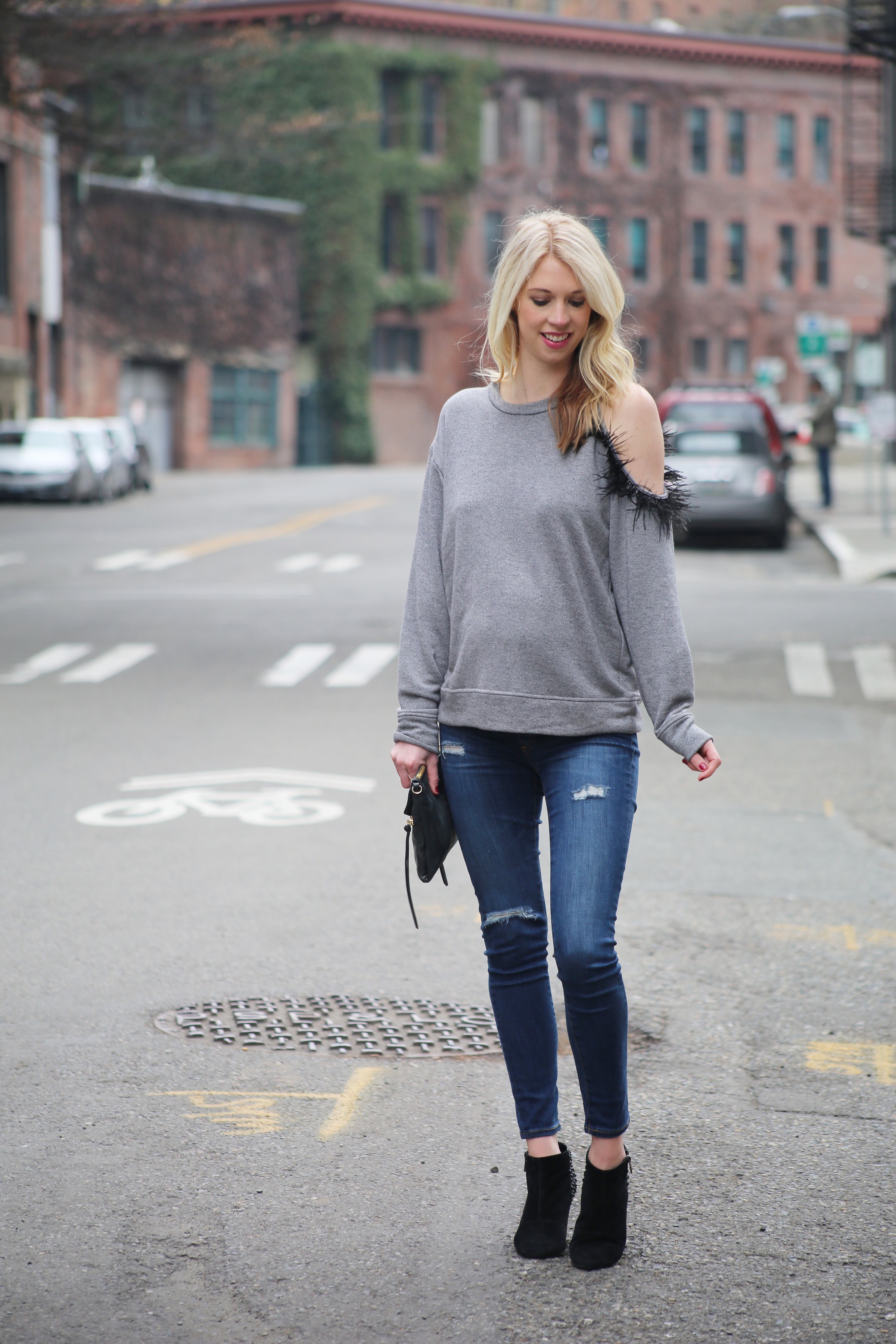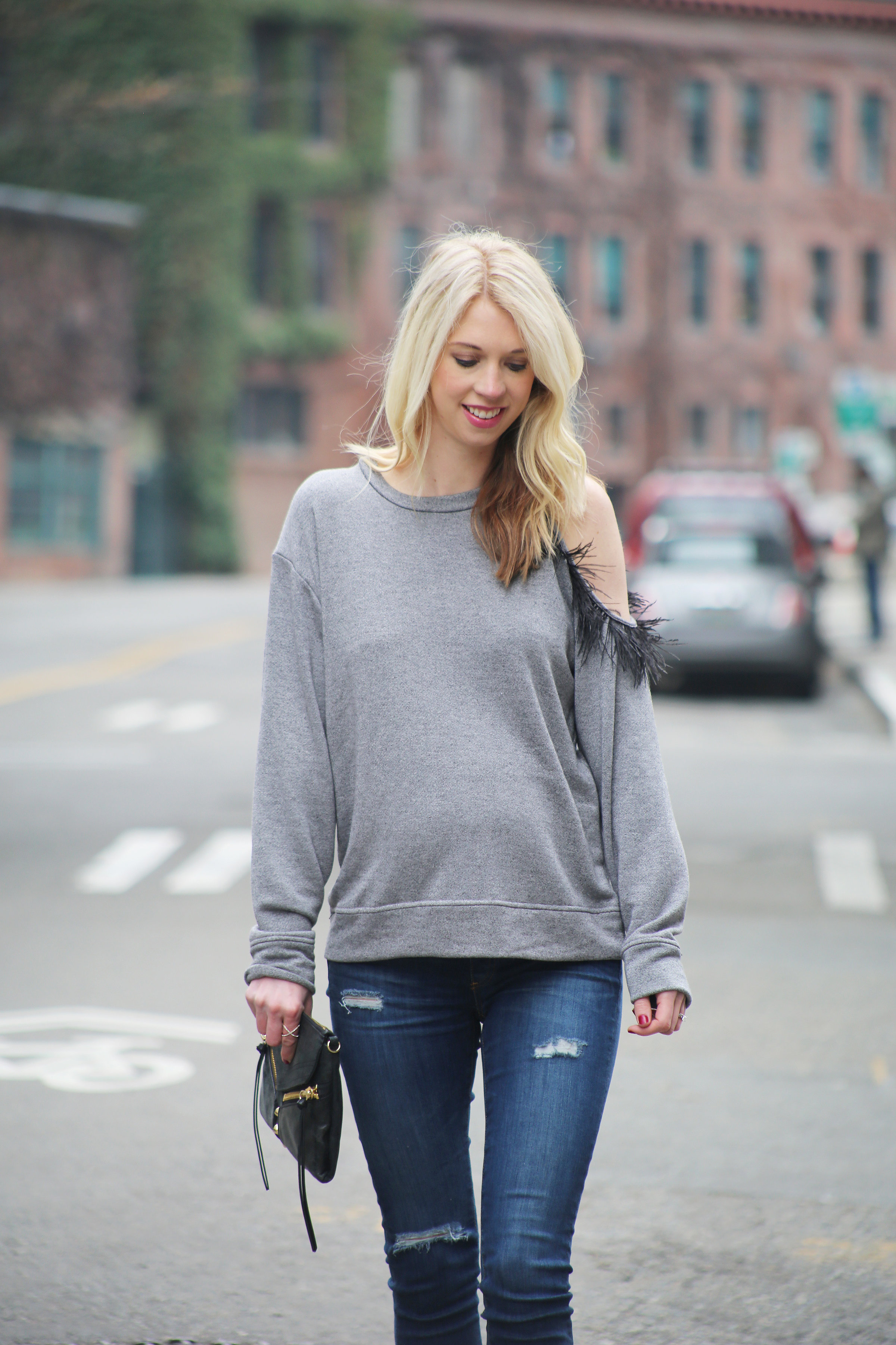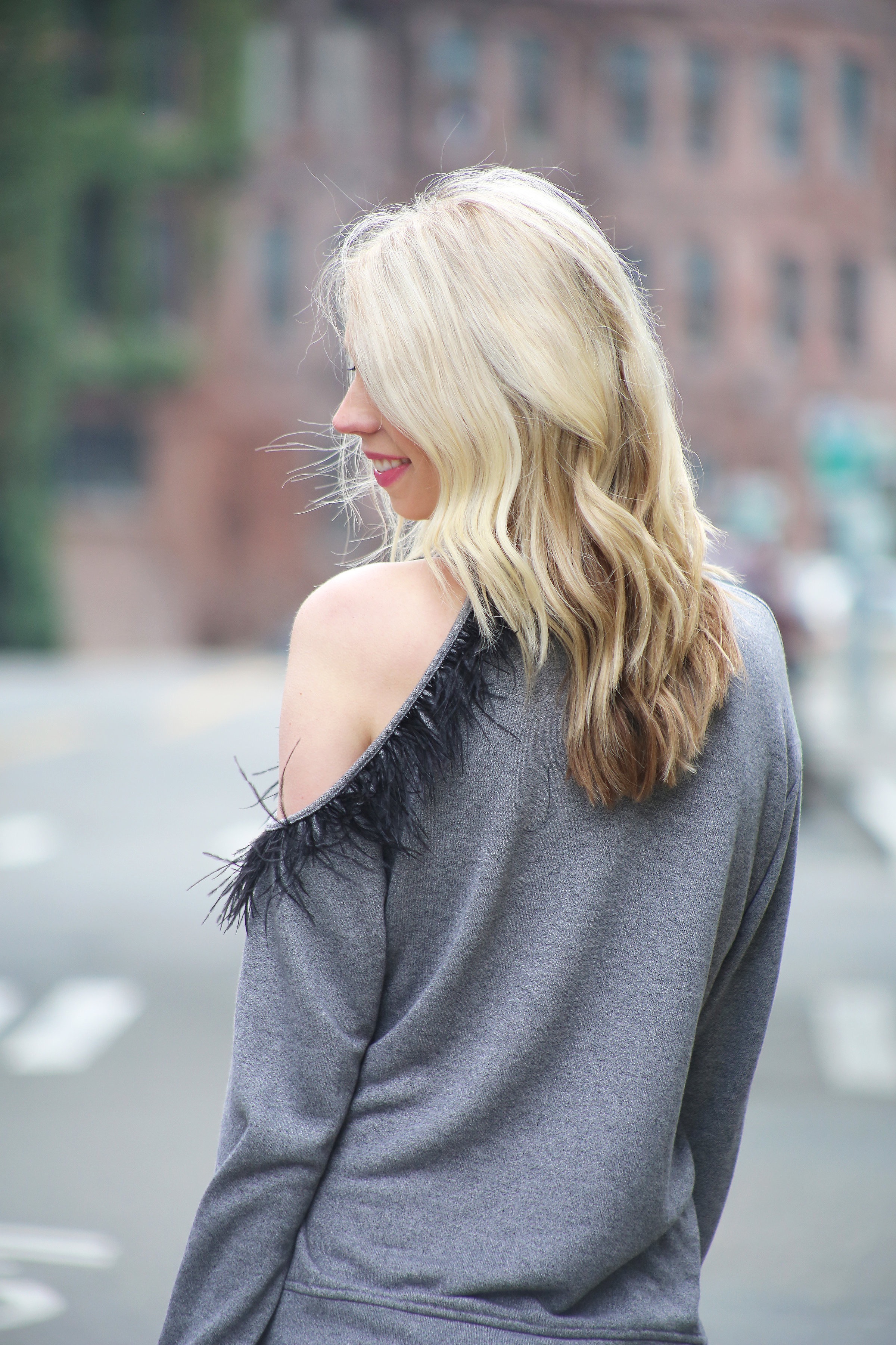 I am all about being comfortable in my clothes and athleisure is always my go to. When I saw this feather detail sweatshirt, I had to buy it. I love that it is sweatshirt material but has the open one shoulder and feather detailing to dress it up. You will be seeing me in this top a lot this Spring before and after baby!