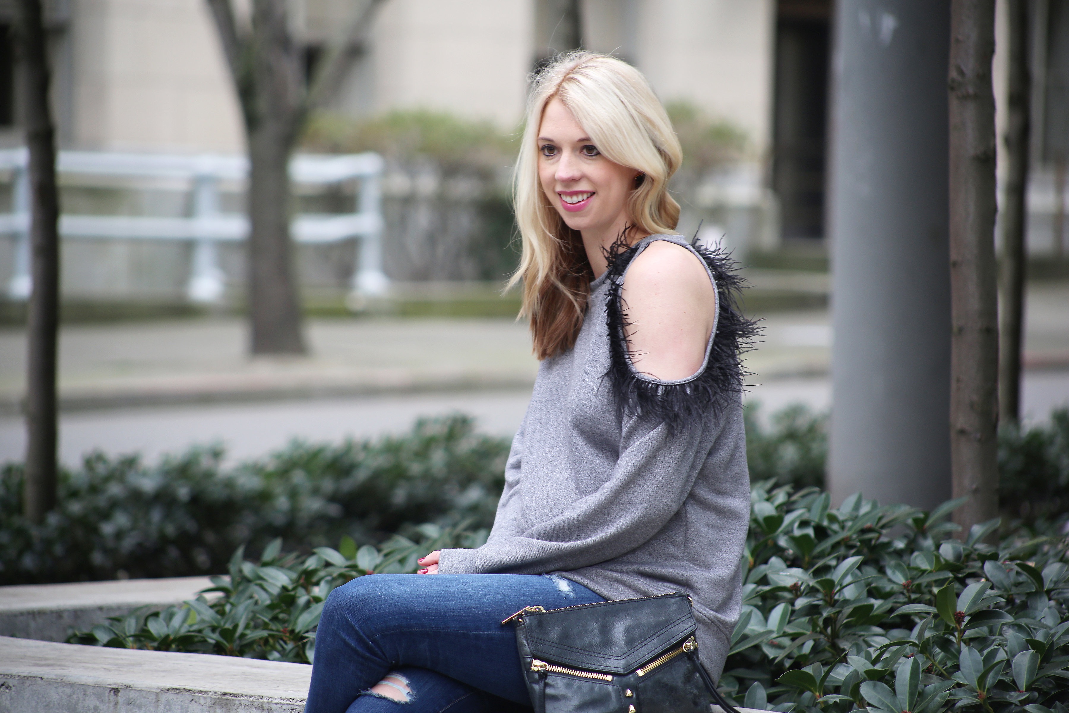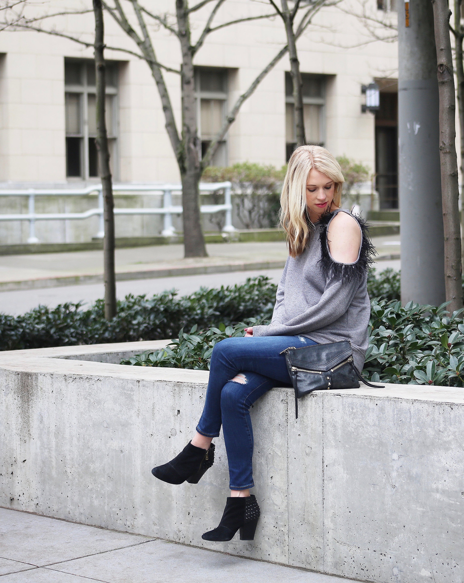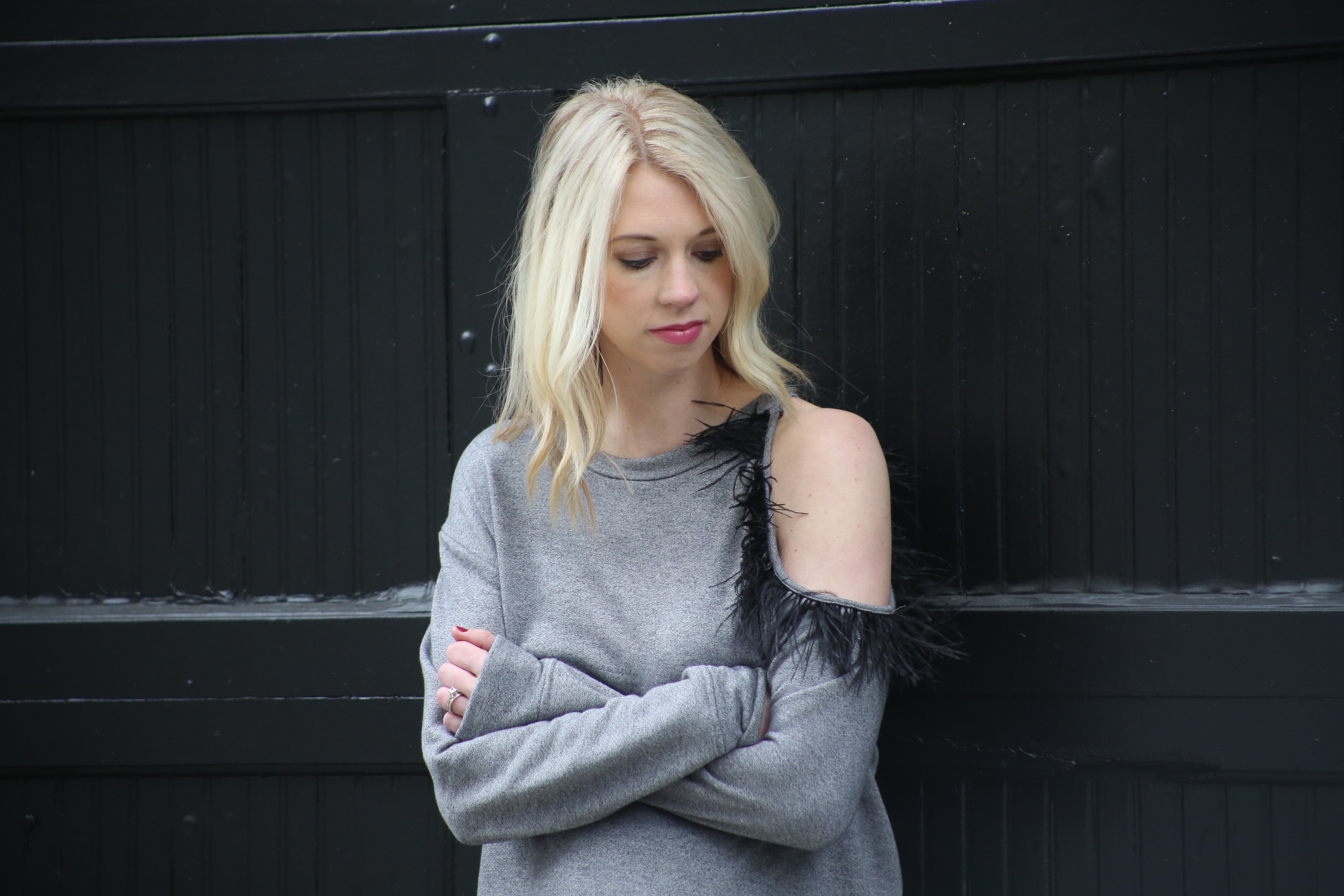 I am all about being comfortable in my clothes and athleisure is always my go to. When I saw this feather detail sweatshirt, I had to buy it. I love that it is sweatshirt material but has the open one shoulder and feather detailing to dress it up. You will be seeing me in this top a lot this Spring before and after baby!