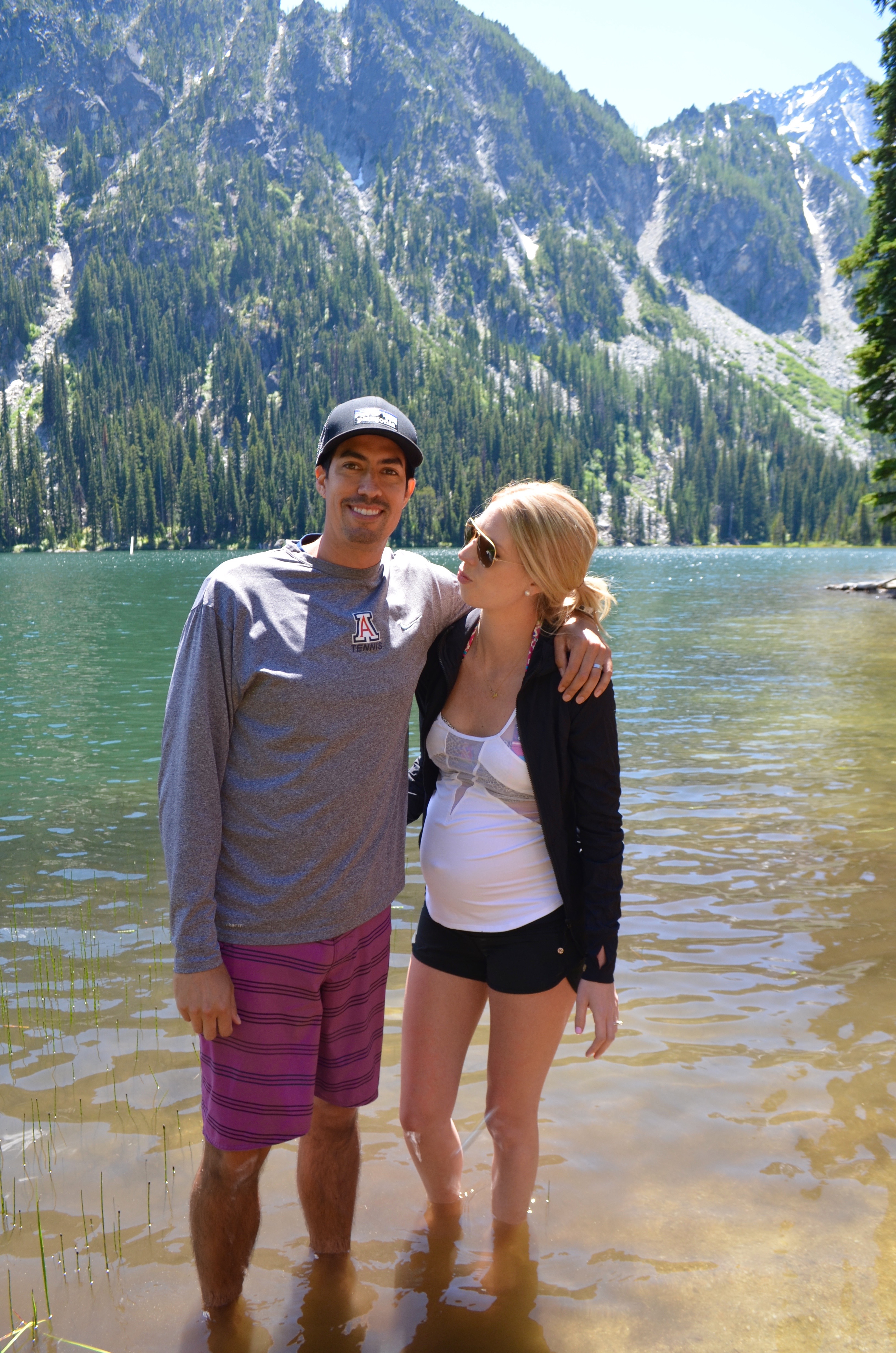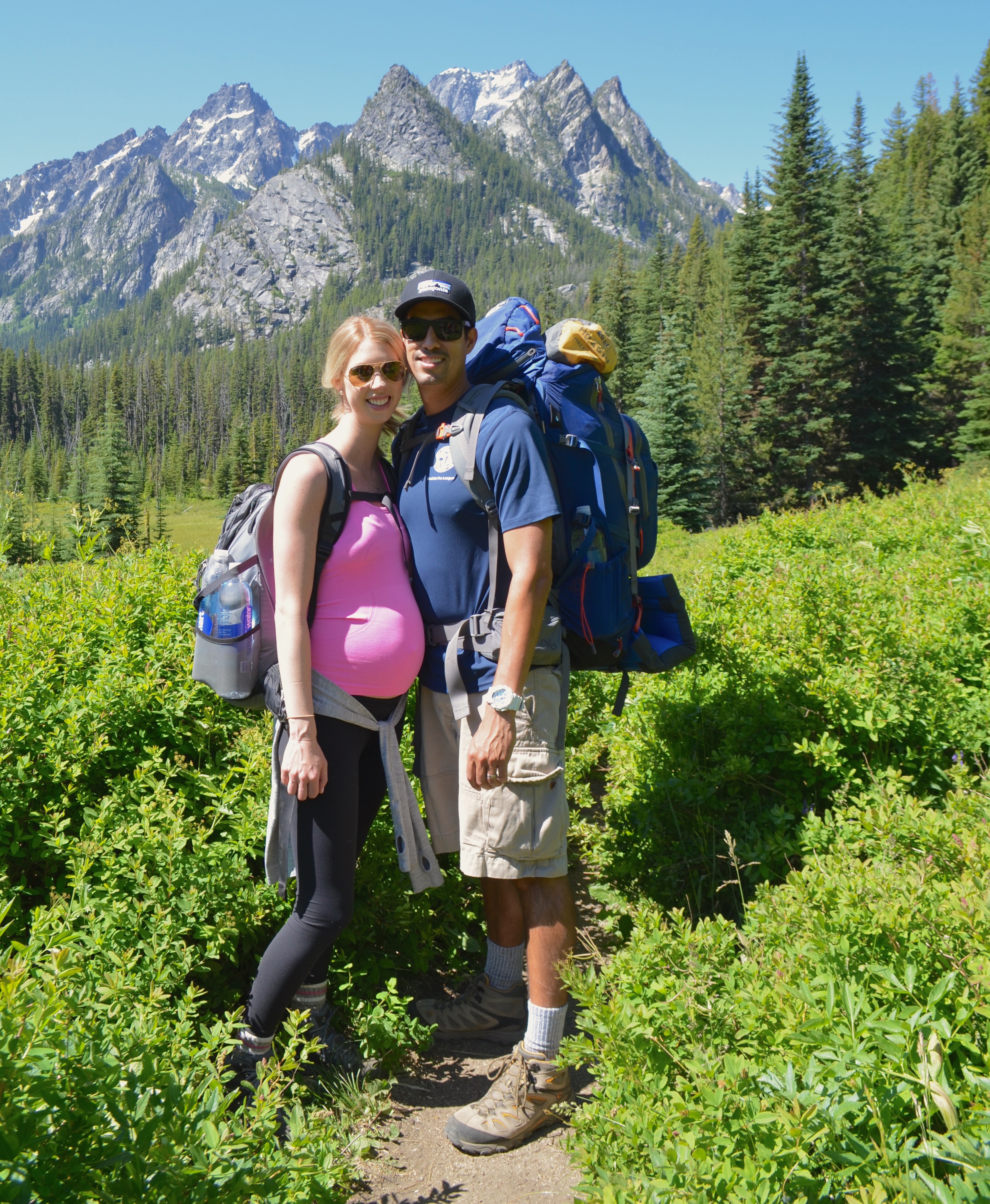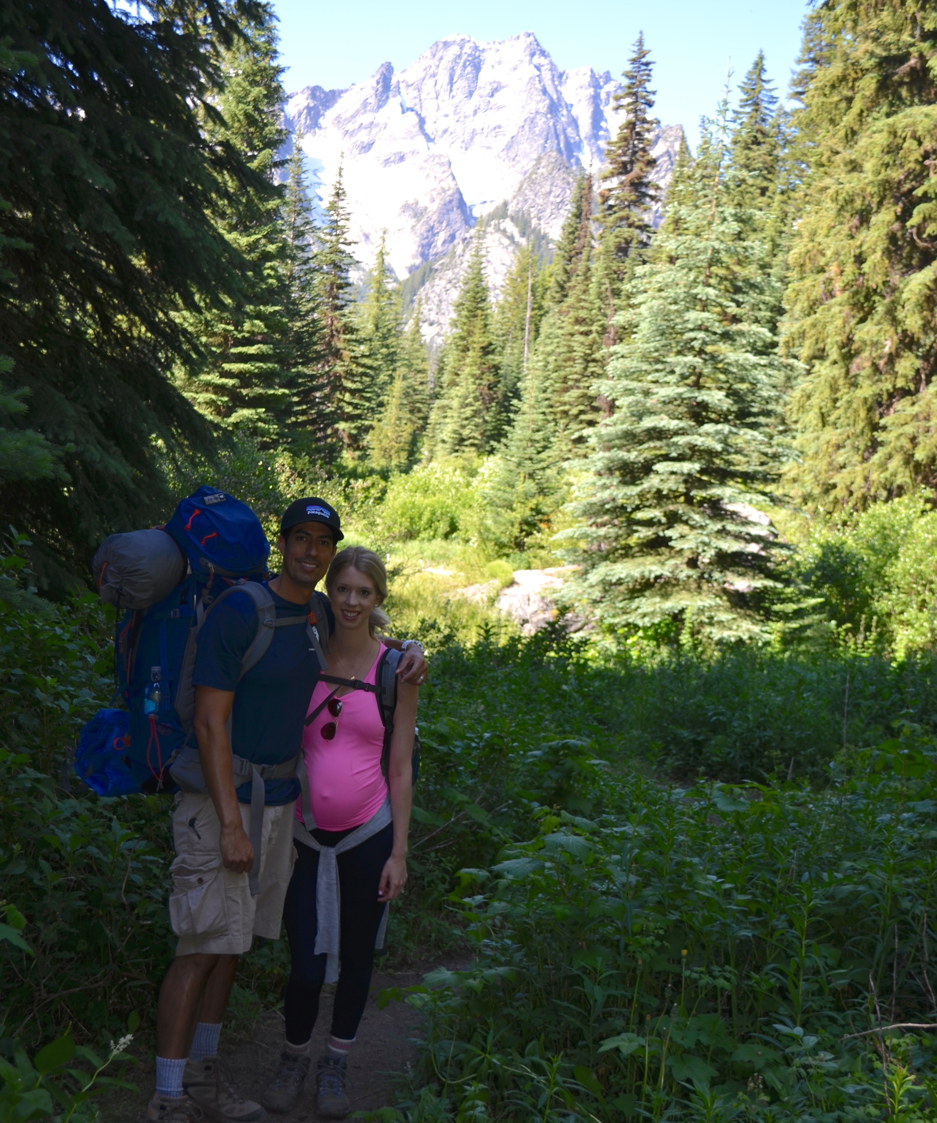 We left Friday night and and stayed in a hotel outside of Leavenworth so we could get an early start Saturday morning. We got up at 7am and drove to the trailhead. Four miles of the drive was on a roller coaster dirt road filled with potholes. We finally got our hike started around 8:30am. The hike was strenuous but not overly difficult with a 1600 ft elevation gain over 4.6 miles. I had to take more breaks than I normally would have being 6 months pregnant. I have to give a huge thanks to my husband who carried all our heavy gear (tent, sleeping bags & whatever else we could fit in his huge 3 liter backpack). I borrowed a friend’s day backpack which was much smaller but we still packed it full of what we could.